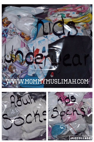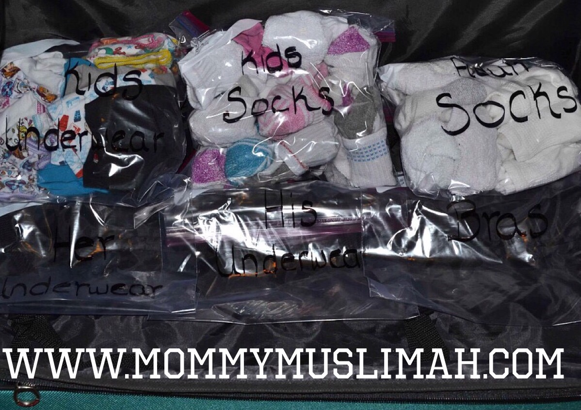 For my own sanity, my suitcases contain a few pre-labeled Ziplocs for some of the necessities: kids’ socks, underwear, adults socks, and adult HIS & HER undergarments.